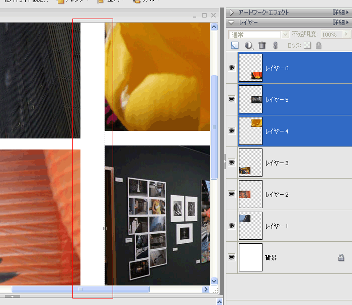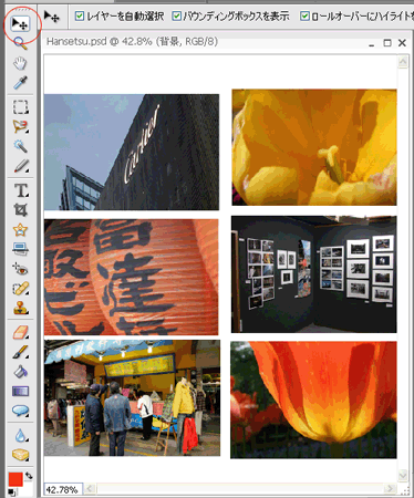 「移動ツール」を選択し、それぞれの写真に少し隙間ができるようにマウスで動かし、ここで実際の順番で並べる。