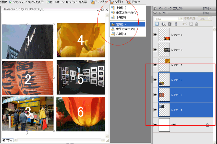 今度は同じように右側の縦3枚(4〜6)を揃えるので、レイヤーの4〜6を選択し、「整列」→「右端」
