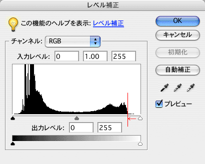 まずはレベル補正で明るさを見てみましょう。画面中央上の白いハイライトの飛び具合を見ながら調整します。