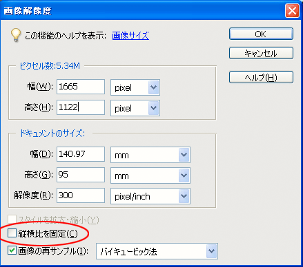 よってフチ無しプリントを行う場合は、左図のように「縦横比の固定」のチェックをハズし任意の数値を入れる。 プリンターの用紙設定は「フチ無し」を選び、「はみ出し量」は「標準」を選ぶ。 |
