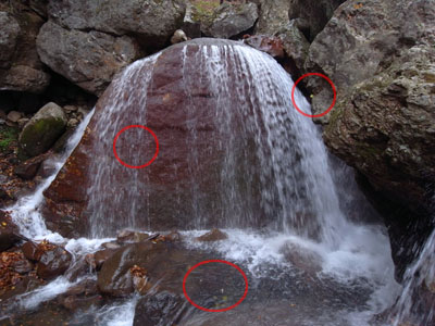 最後に赤丸の箇所のゴミを修正します。方法は「B_1.jpg」で述べたのと同様、近くの似たような箇所をコピーします。 円は少し消したい箇所の二回り大きいくらい。 失敗したら、ctrl + Z、またはヒストリーで戻る。