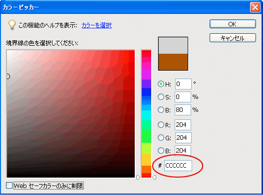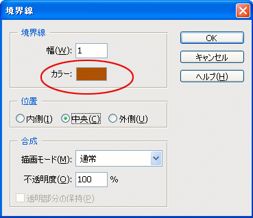 左画像のダイアログが表示されるので、幅は「1」として、カラーの枠をクリック。
