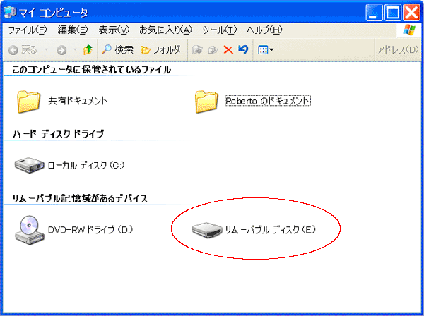 1) 取り敢えずメディアリーダーをパソコンに接続すると「マイ コンピューター」には「リムーバブルディスク」というアイコンが表示される。 |