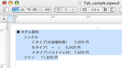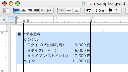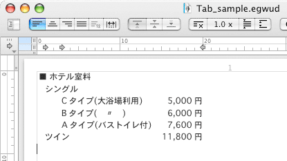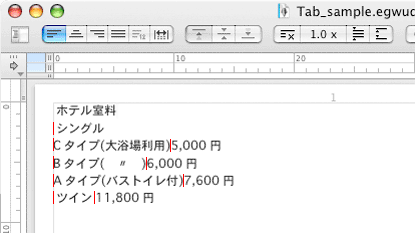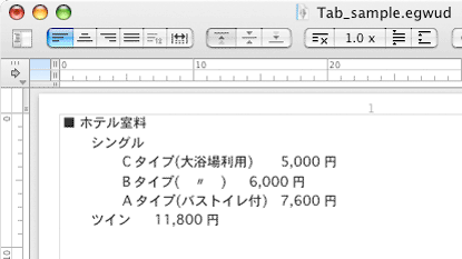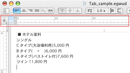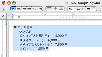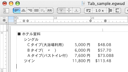 次にC〜Aタイプを揃えます。最後は金額ですが、これは逆に「円」に合わせるのでタブの揃えを「右揃え」にしてタグマーカーを任意な位置までスライドさせて終了です。