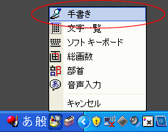 ![]() 左写真のようなサブメニューが現れるので、一番上の「手書き」を選択。 違う画面だったらクリックしたアイコンが違っているか、日本語入力設定が違うので、そのアイコンを右クリック → プロパティ → ・・・分からなかったらメール下さい。
