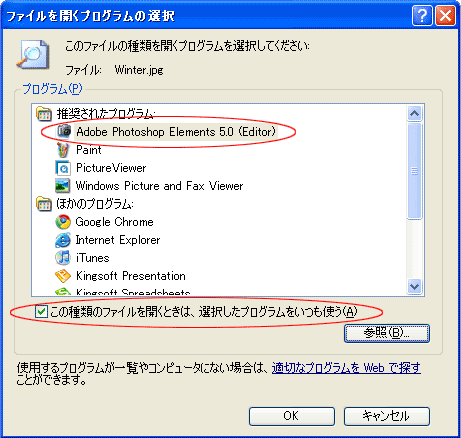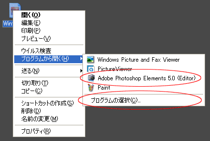 1) 任意のjpgの画像アイコンを右クリック → 「プログラムから開く(H)」。サブメニューの「Adobe Photoshop Elements 5.0(Edtior)」を選択すると、その画像ファイルだけがElementsで開きます。 ここでは全てのjpgをElemenstなので、最下部の「プログラムの選択(C)」を選択します。
